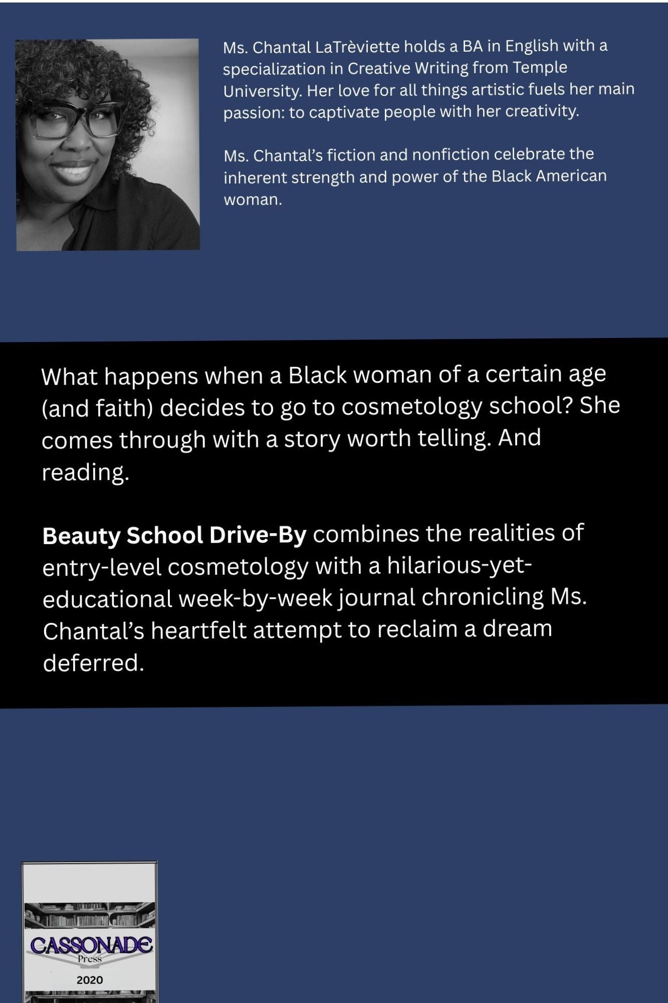 Beauty School Drive-By combines the realities of entry-level cosmetology with a hilarious, week-by-week journal chronicling Ms. Chantal’s heartfelt attempt to reclaim a dream deferred.